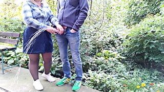 Hot golden shower from a big cock outdoors